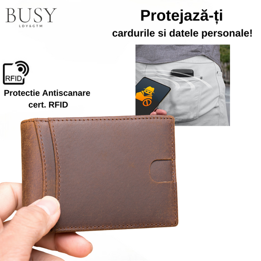 Portofel barbati slim NoScan Buyak, piele naturala premium, antiscanare carduri RFID, maro