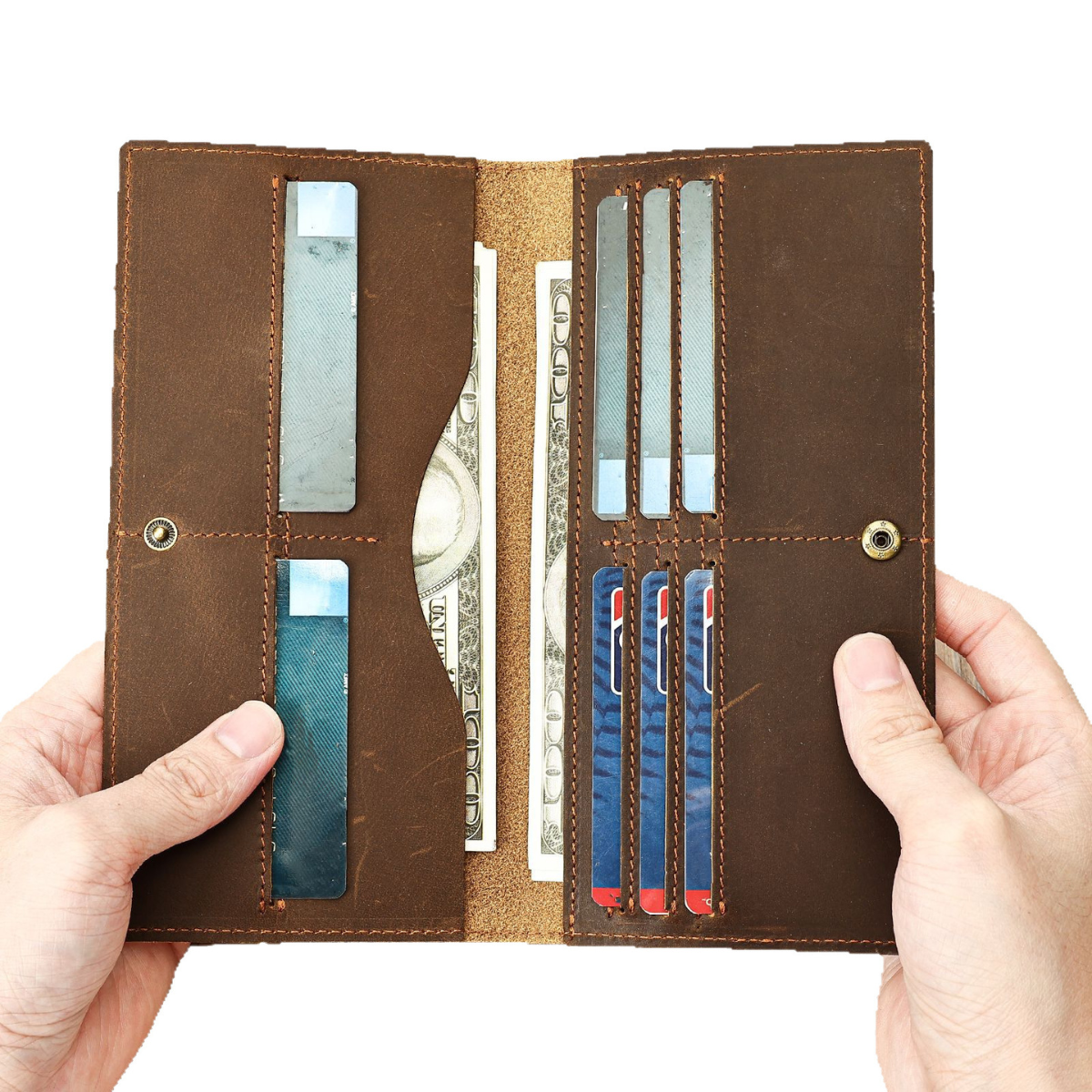 Realizat din piele naturală Crazy Horse, acest portofel aduce eleganța designului retro într-un accesoriu practic și durabil. Cu sloturi pentru carduri și sloturi pentru bancnote, completează perfect viața urbană, oferind stil și funcționalitate în același timp.