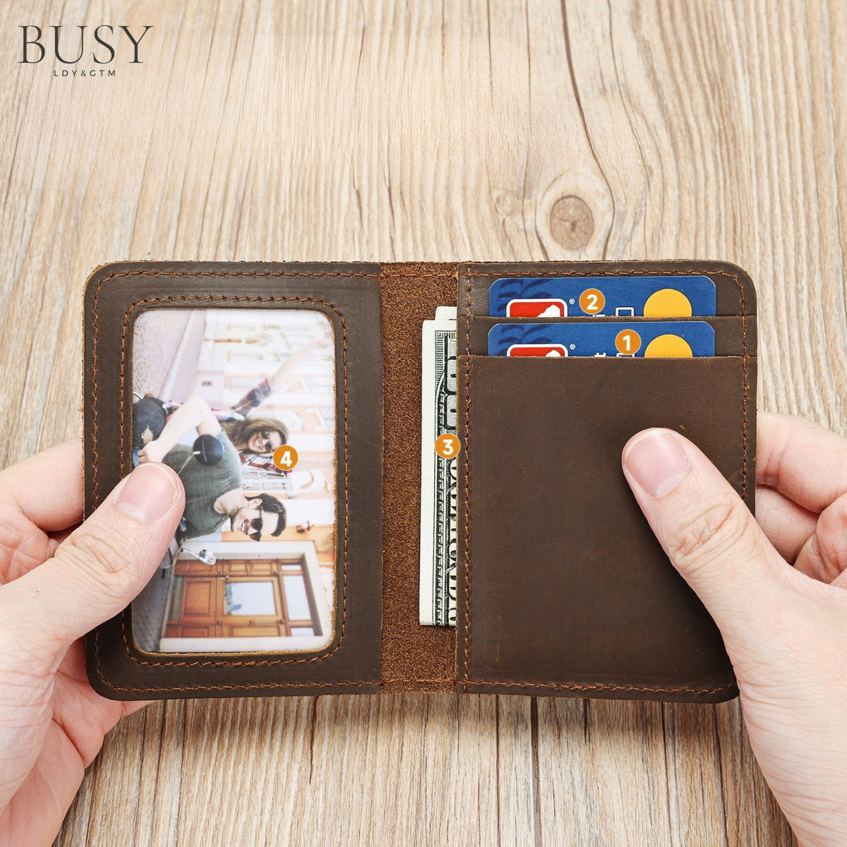 Realizat din piele naturală Crazy Horse, acest portofel compact de 10,5x1x8 cm aduce eleganța designului retro într-un accesoriu practic și durabil. Cu sloturi pentru carduri și un spațiu dedicat pentru fotografie, completează perfect viața urbană, oferind stil și funcționalitate în același timp.